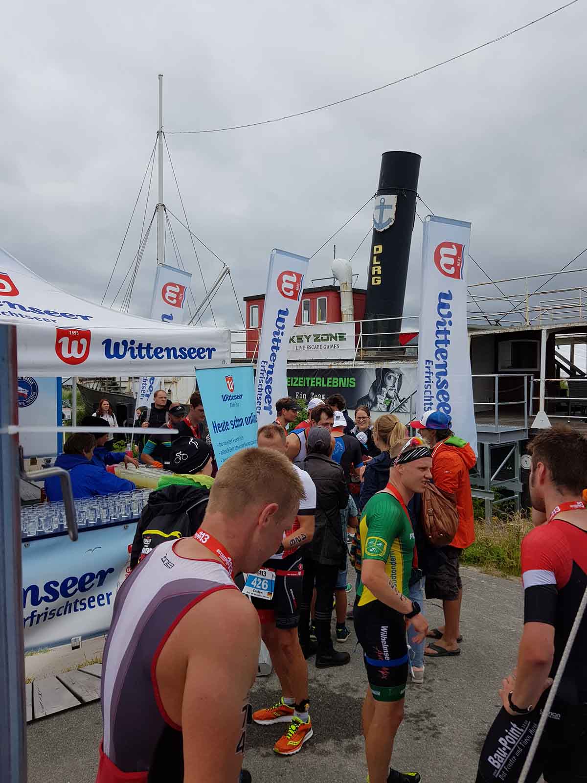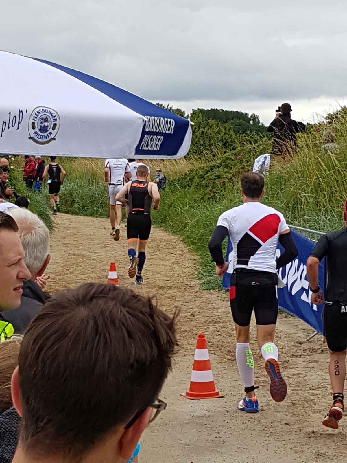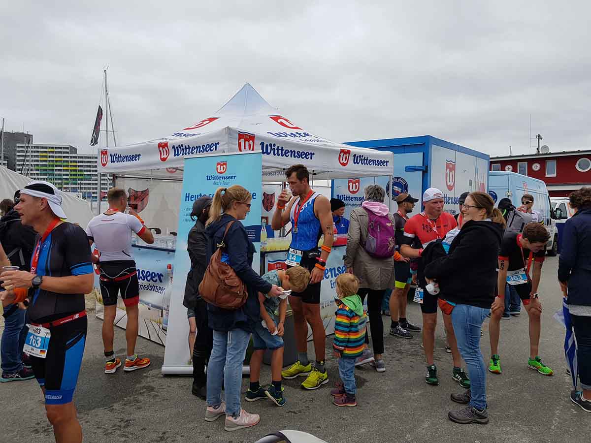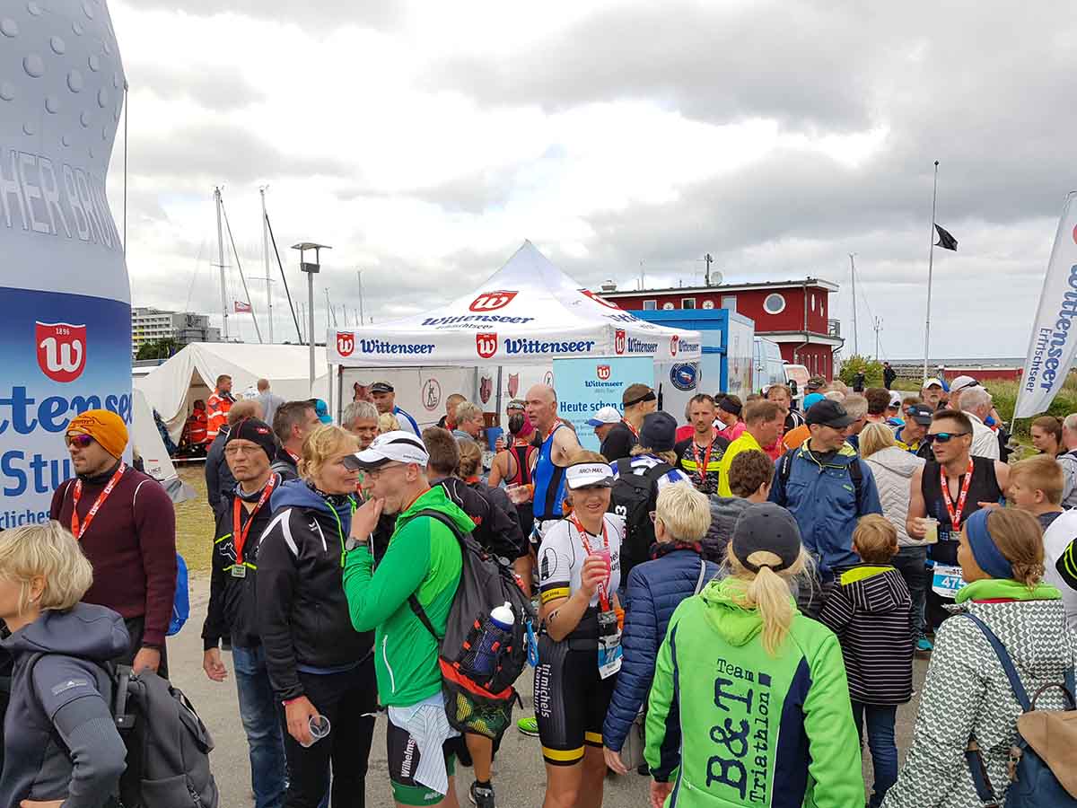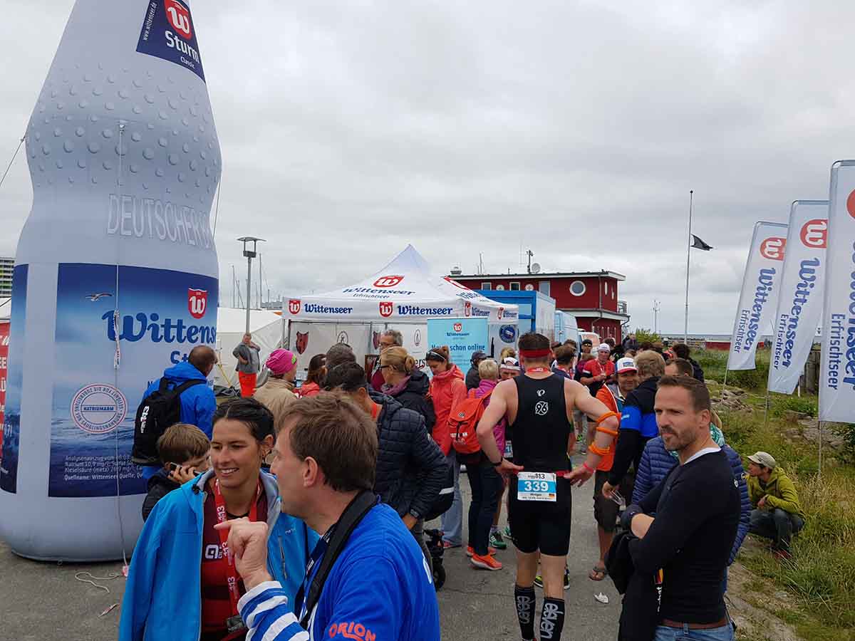 Anschließend wurde in der Wechselzone auf dem Yachthafen-Gelände der Neo gegen das Triathlonrad eingetauscht und 90 km geradelt. Danach ging es auf die neue Laufstrecke, die nun nicht mehr wie im Vorjahr von Damp aus nach Norden, sondern nach Süden führt. Die neue Laufstrecke führt im ersten Teil durch die schöne Dünenlandschaft parallel zum Strand und knickt dann ein bisschen ins Hinterland ab. Der Untergrund auf dem ersten Drittel besteht aus Sand, der allerdings fest und gut zu laufen ist. Sean Donelly war als erster nach 3:52:15 h zurück im Ziel auf der Niebymole und wurde gebührend von den Zuschauern empfangen. Trotz des trüben Wetters, das für die Athleten allerdings recht angenehm war, war die Stimmung im Ziel hervorragend und auch der Durst nach Zielverpflegung von Wittenseer groß. Alle Ergebnisse findet ihr hier: http://gluecksburg-half.r.mikatiming.de/2018/