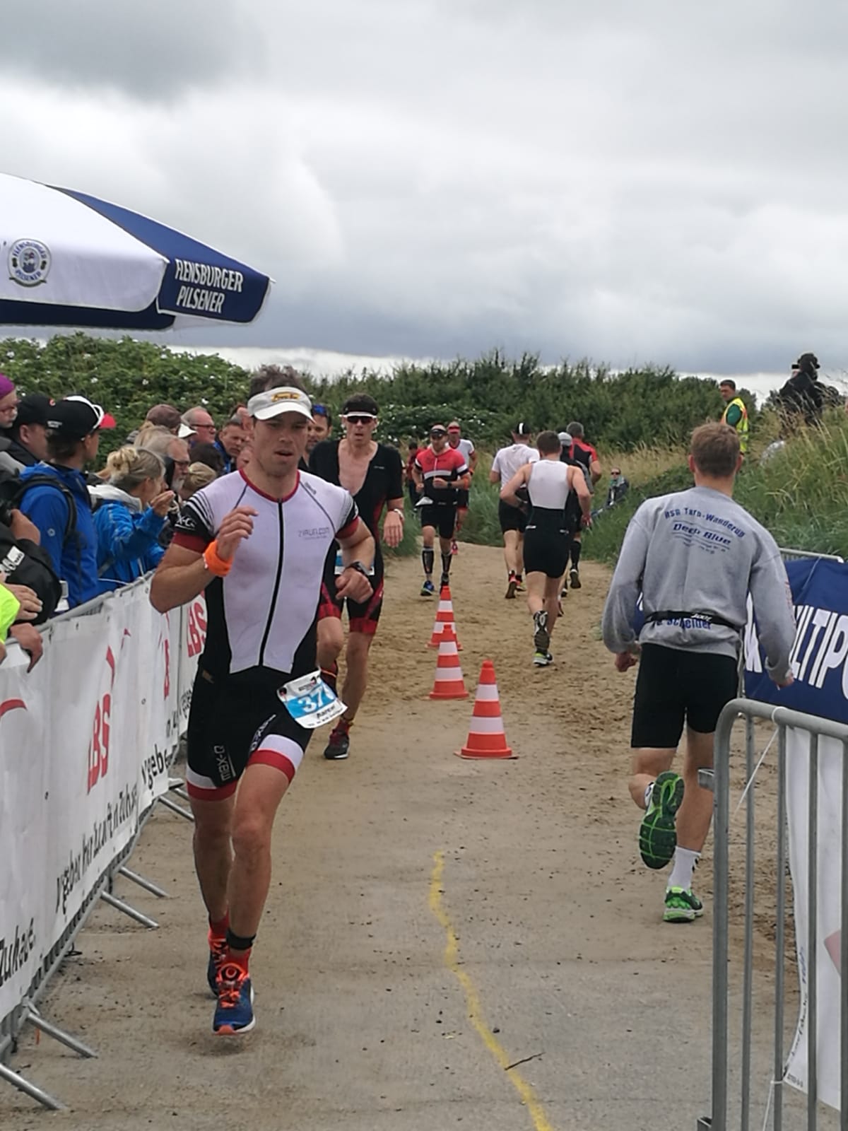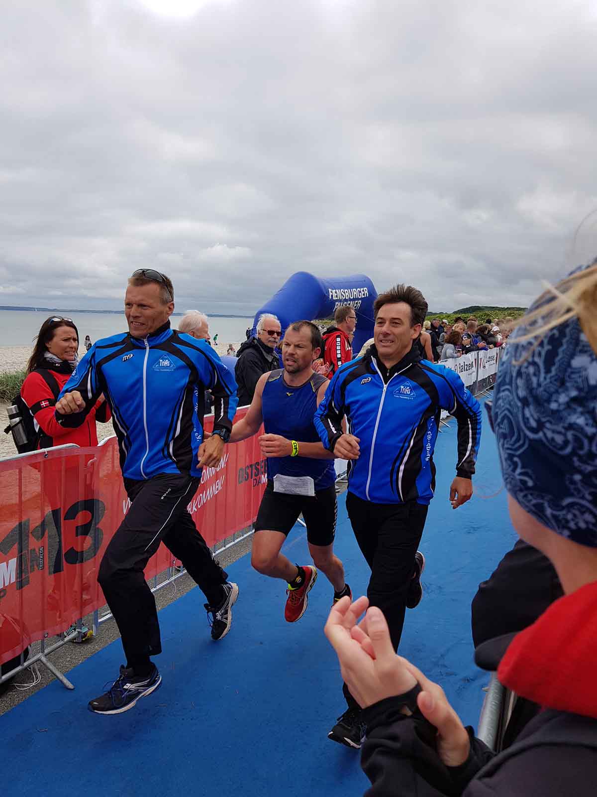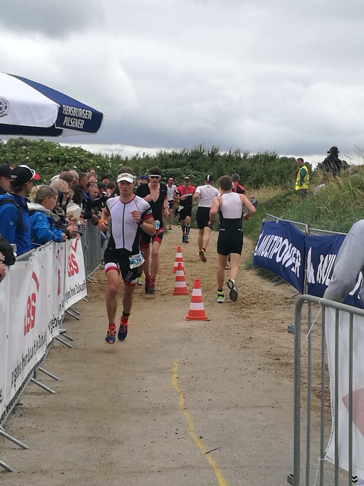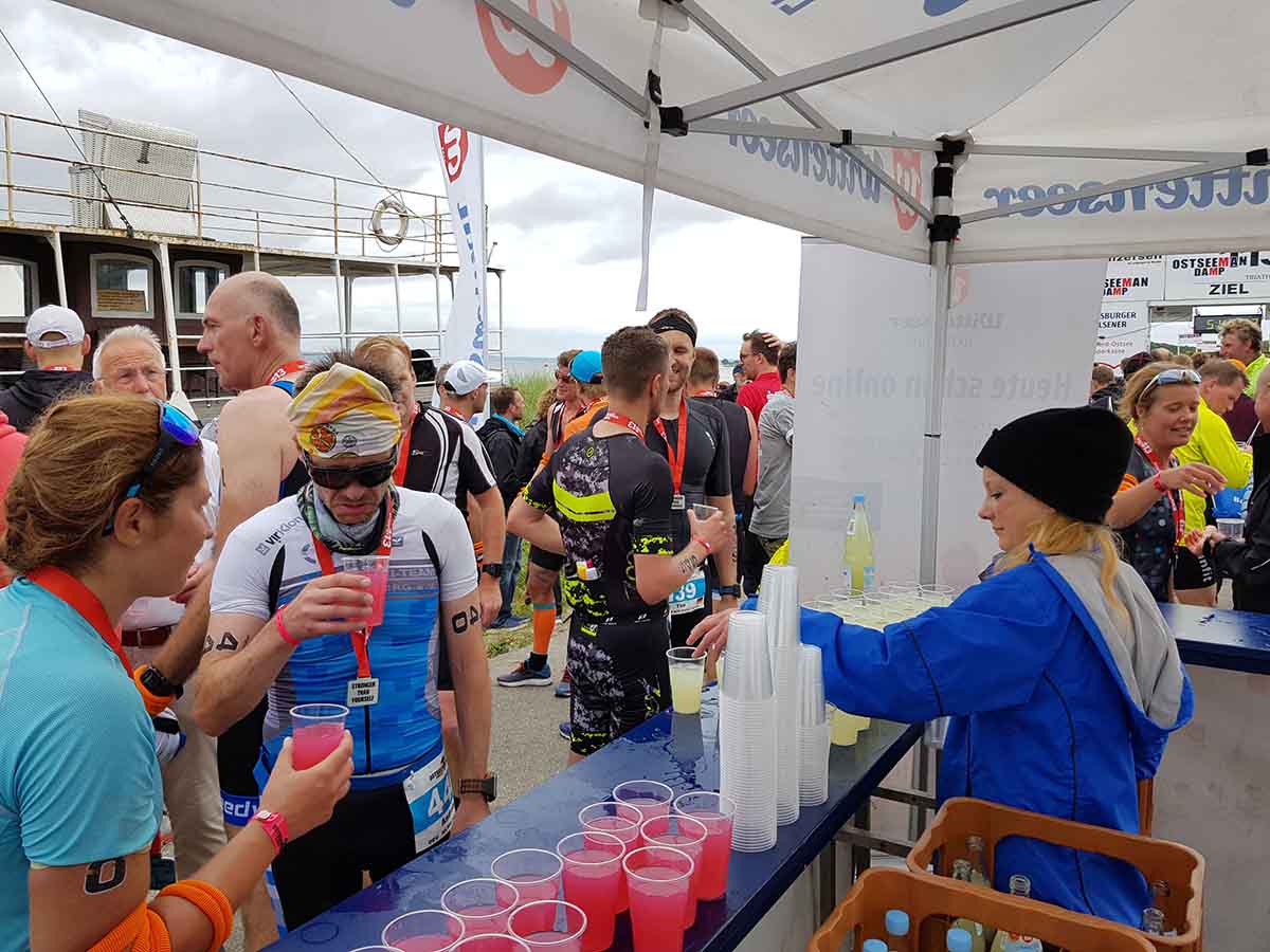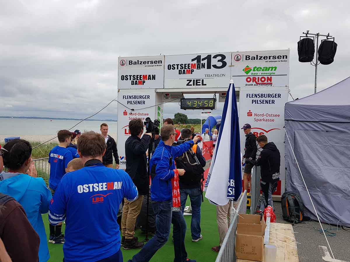 Anschließend wurde in der Wechselzone auf dem Yachthafen-Gelände der Neo gegen das Triathlonrad eingetauscht und 90 km geradelt. Danach ging es auf die neue Laufstrecke, die nun nicht mehr wie im Vorjahr von Damp aus nach Norden, sondern nach Süden führt. Die neue Laufstrecke führt im ersten Teil durch die schöne Dünenlandschaft parallel zum Strand und knickt dann ein bisschen ins Hinterland ab. Der Untergrund auf dem ersten Drittel besteht aus Sand, der allerdings fest und gut zu laufen ist. Sean Donelly war als erster nach 3:52:15 h zurück im Ziel auf der Niebymole und wurde gebührend von den Zuschauern empfangen. Trotz des trüben Wetters, das für die Athleten allerdings recht angenehm war, war die Stimmung im Ziel hervorragend und auch der Durst nach Zielverpflegung von Wittenseer groß. Alle Ergebnisse findet ihr hier: http://gluecksburg-half.r.mikatiming.de/2018/
