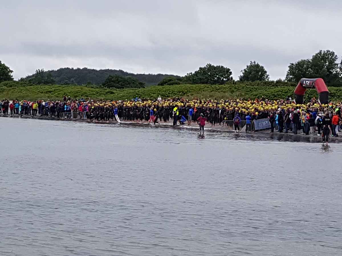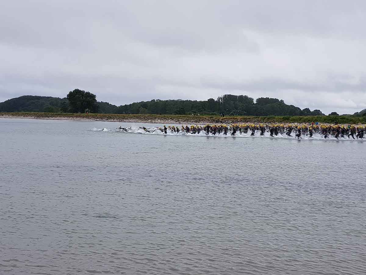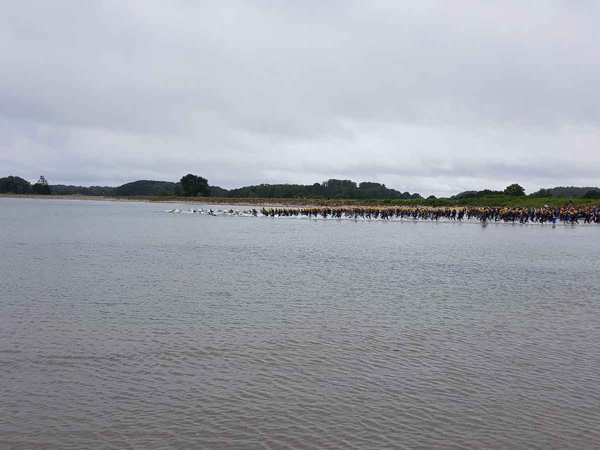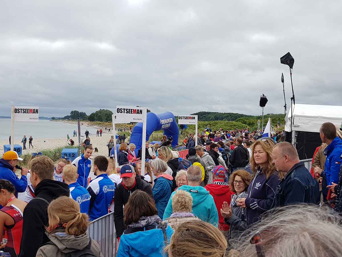 1100 Starter bei der 2. Auflage des Ostseeman 113 Damp. Die Ostsee-Mitteldistanz wartete mit einer neuen Laufstrecke auf. Auch der neue Zielbereich auf der Mole ist nun noch näher an den Strand gerückt. Los ging es für die Einzelstarter des OstseeMan 2018 um 9.00 Uhr vom Strand aus auf die Schwimmstrecke durch die spiegelglatte, 15 Grad kalte Ostsee.