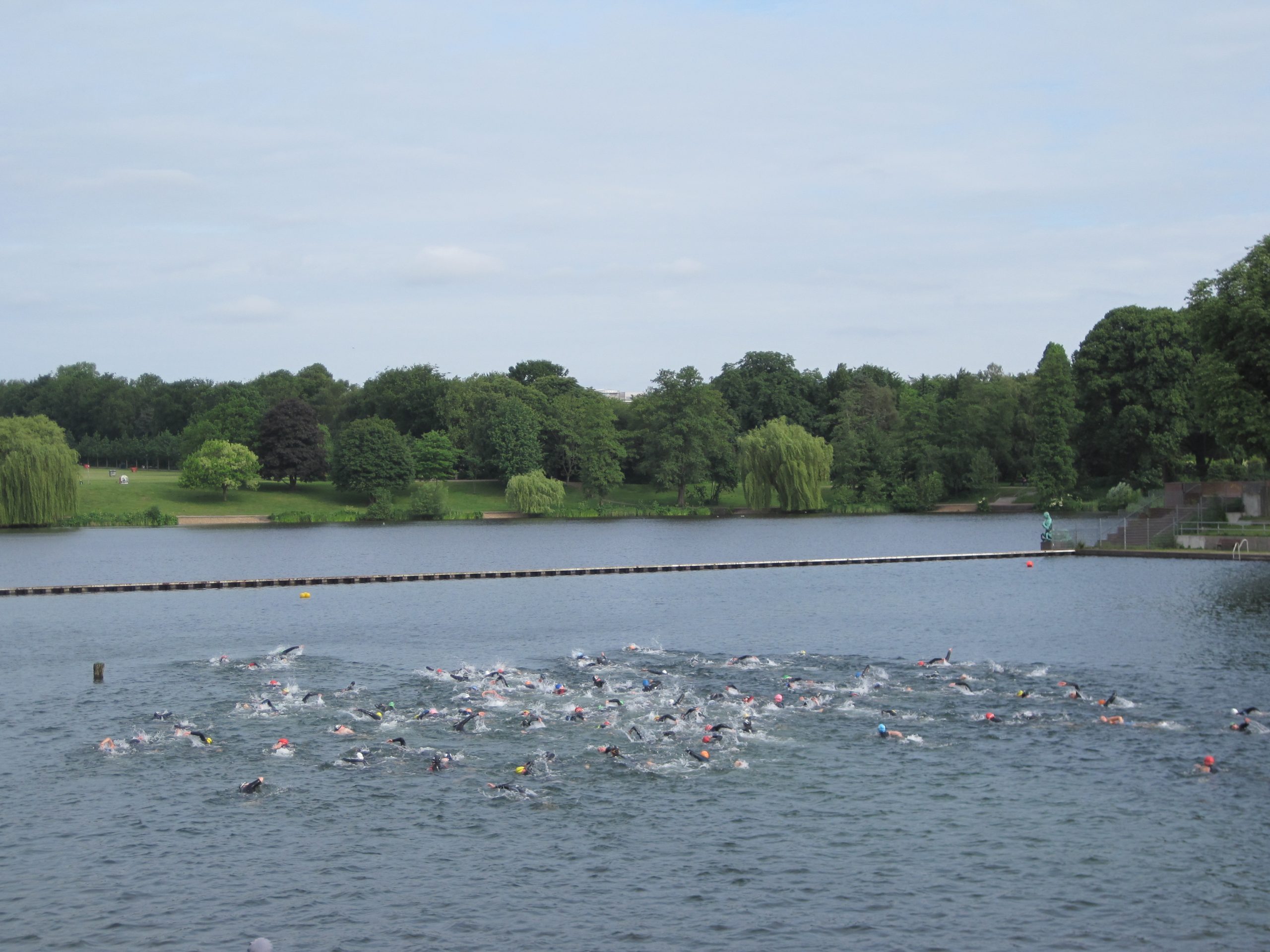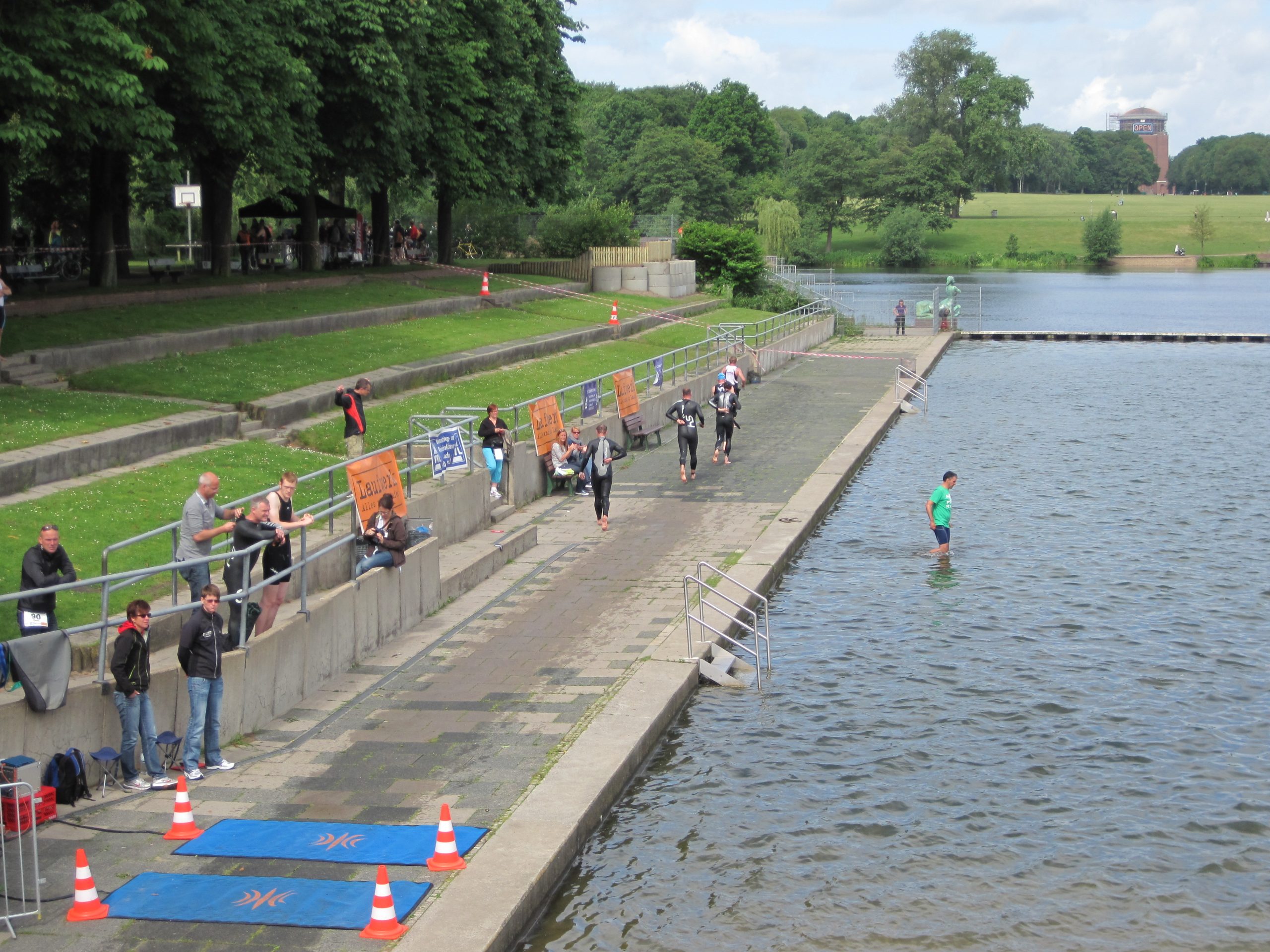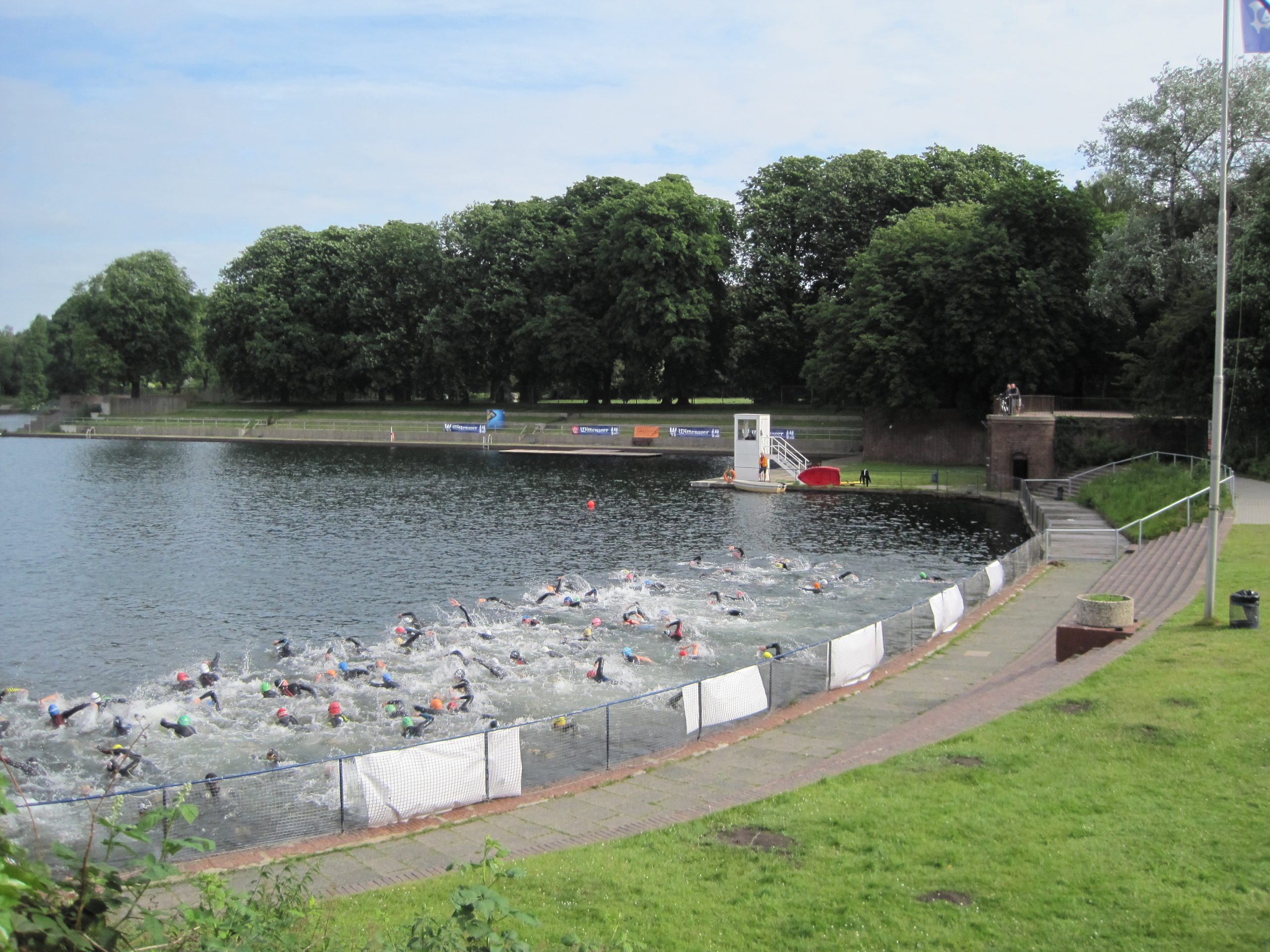 Der 14. Stadtparktriathlon war wie in den letzten Jahren frühzeitig ausgebucht. 1200 Triathleten schwammen, radelten und liefen im und um den Hamburger Stadtpark, angefeuert von vielen Zuschauern an der Strecke und im Ziel. Das Wetter war „norddeutsch im Juni“, zumindest kein Sturm und Regen.