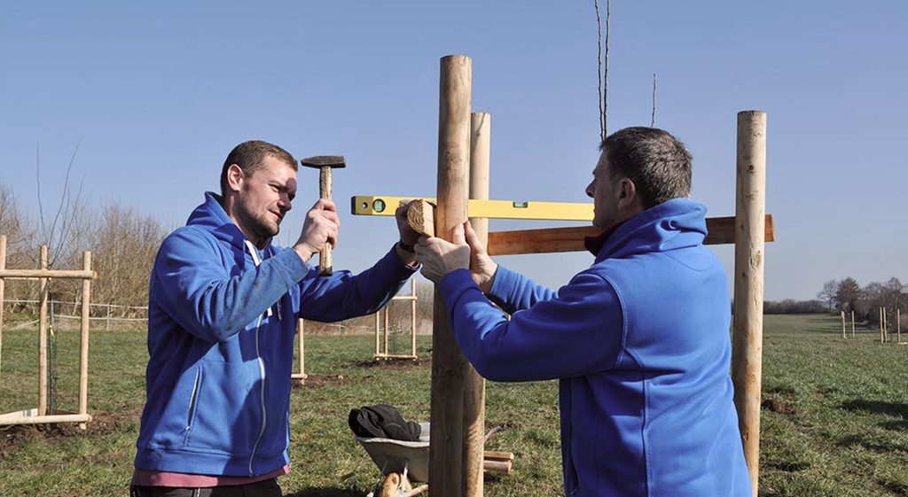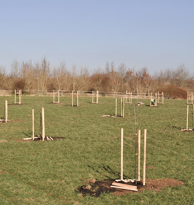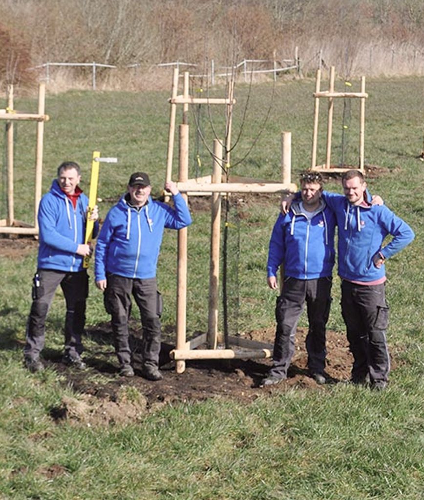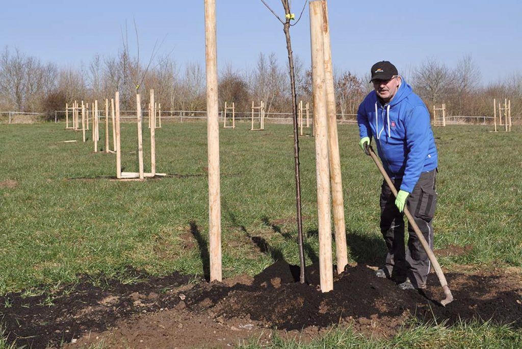 Begonnen haben wir in diesem Frühjahr: Die ersten 68 Hochstammobstbäume konnten gepflanzt und so vorbereitet werden, dass sie in den nächsten Jahren zu kraftvollen Bäumen heranwachsen können. Weitere Baumpflanzungen werden im Herbst folgen.
